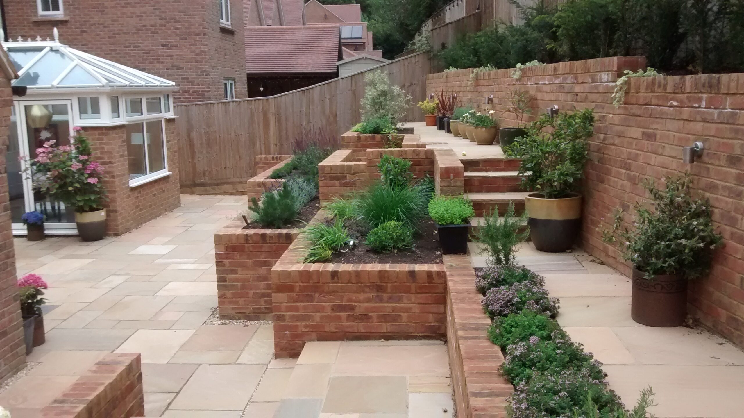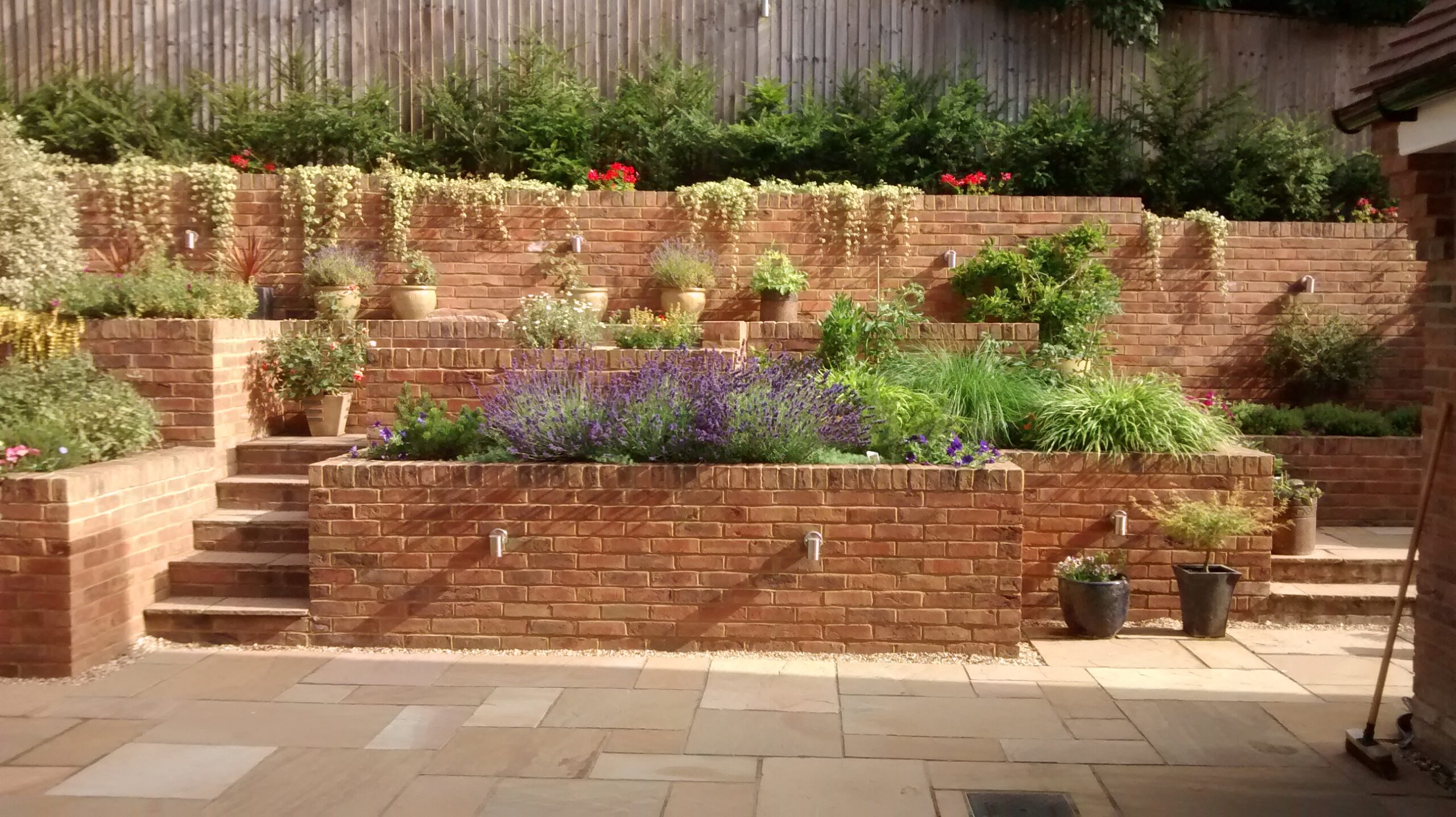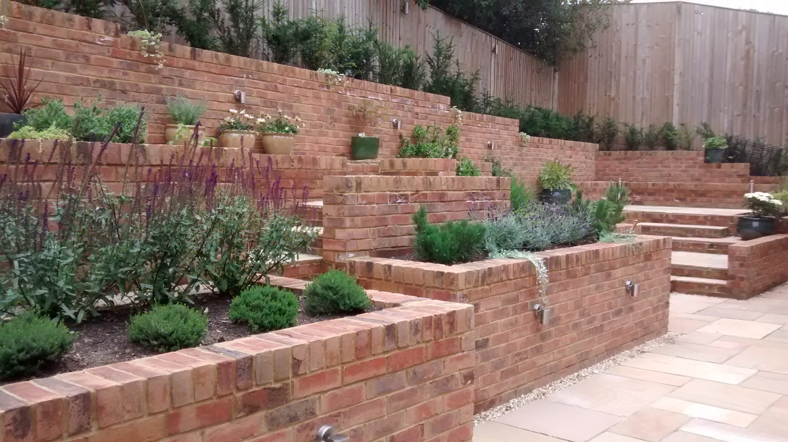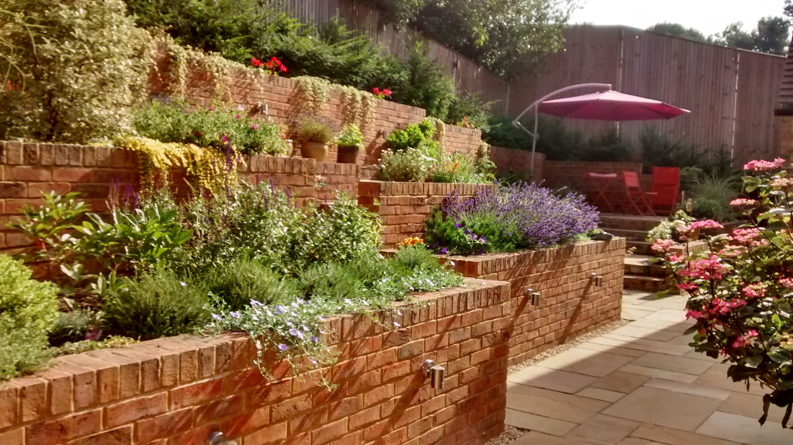 My approach to the brief was to create a larger level area around the house with a series of planted terraces rising to the rear. Steps and paths winding through the terraces would allow access to the beds.
