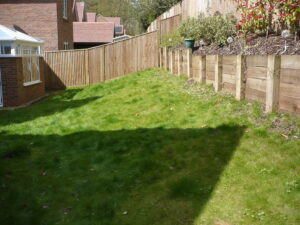 This was a new build property with limited paving, a sloping lawn and a tall timber post retaining wall to the rear.