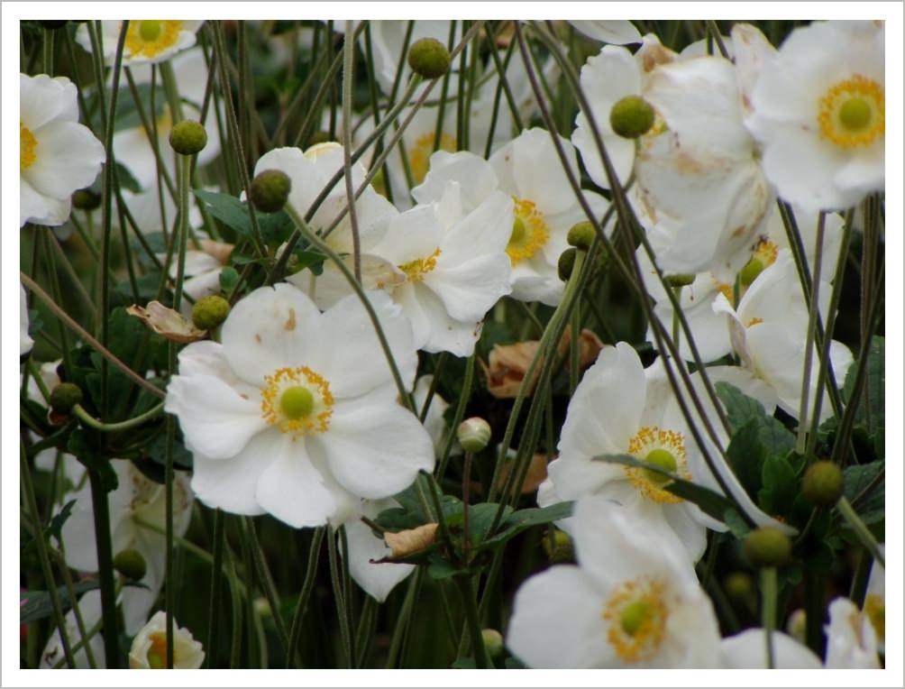 Anemone x hybrida ‘Honorine Jobert’ is a late summer flowering perennial with beautiful white flowers. It prefers some shade if the soil is not kept moist. In the right conditions it will spread so only plant it if there is enough space for it to do so. It is difficult to eradicate if you change your mind!