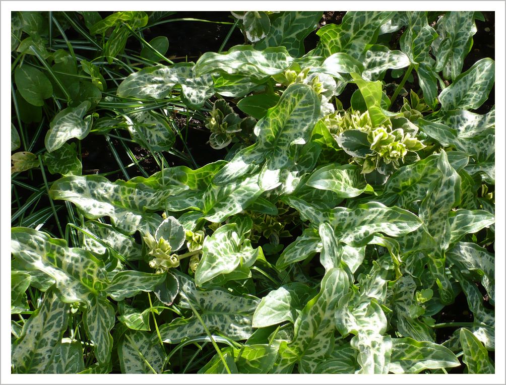 Arum italicum likes shady conditions and has arrow shaped leaves in winter and upright berry shoots in late summer. Nb This plant is toxic.