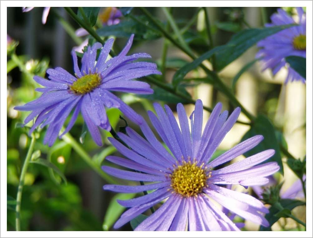Aster x frikartii ‘Monch’ is a pretty late summer flowering perennial with lavender blue daisy shaped flowers with yellow centres. If you cut them down by half in May they will grow more dense and shorter so you should not need to stake them.