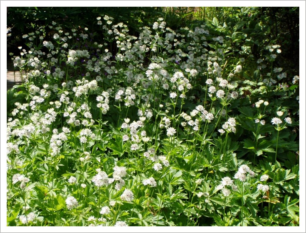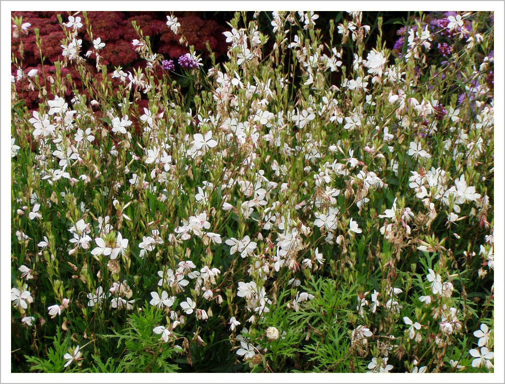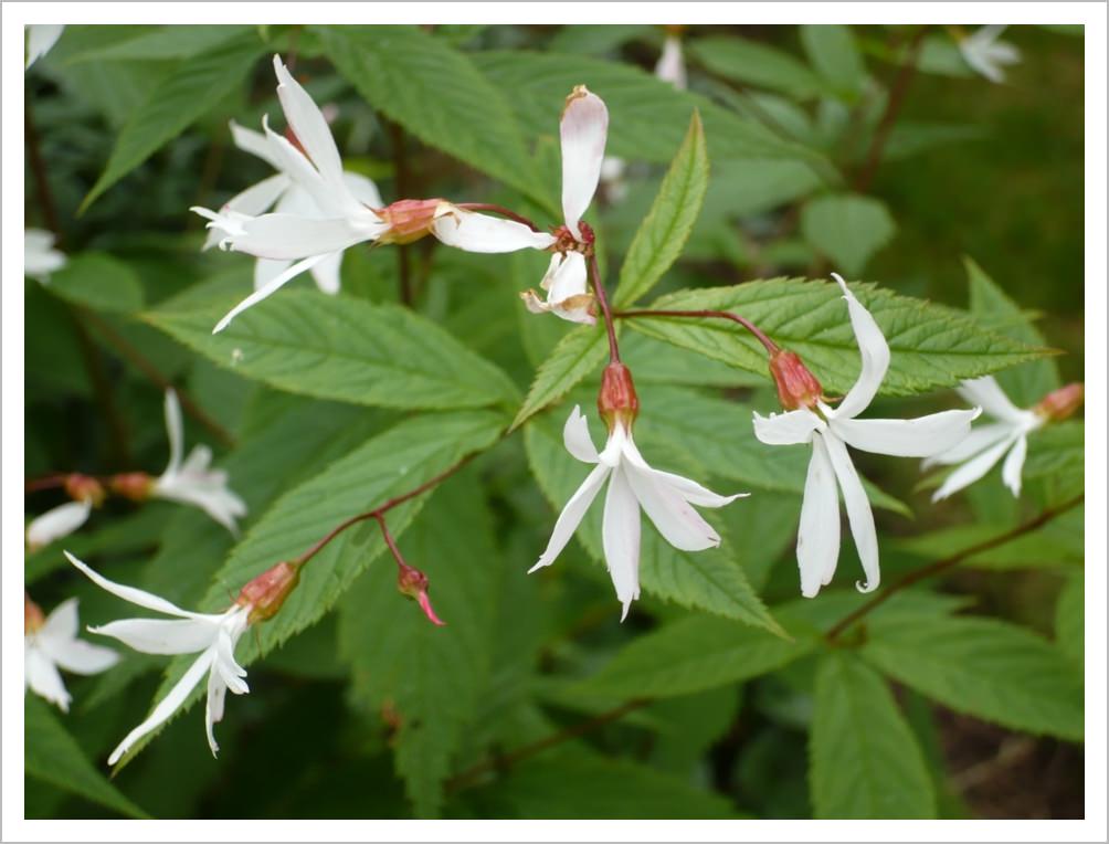 Gillenia trifoliata has masses of pretty white star shaped flowers in midsummer. The foliage turns a lovely red colour in the autumn. It likes a partly shaded spot.