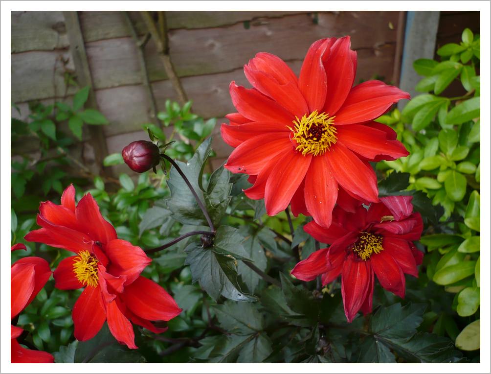 Dahlia ‘Bishop of Llandaff’ has bright red flowers in late summer. Advice is often to lift the tubers but mine have stayed in the ground on well drained soil for the last three years with no detrimental effect.