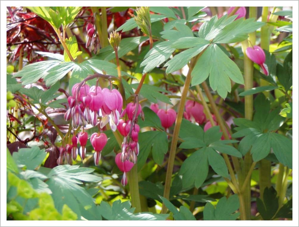 Dicentra spectabilis flowers in spring with pink/white flowers that hang down like pendants. It prefers a shady spot.