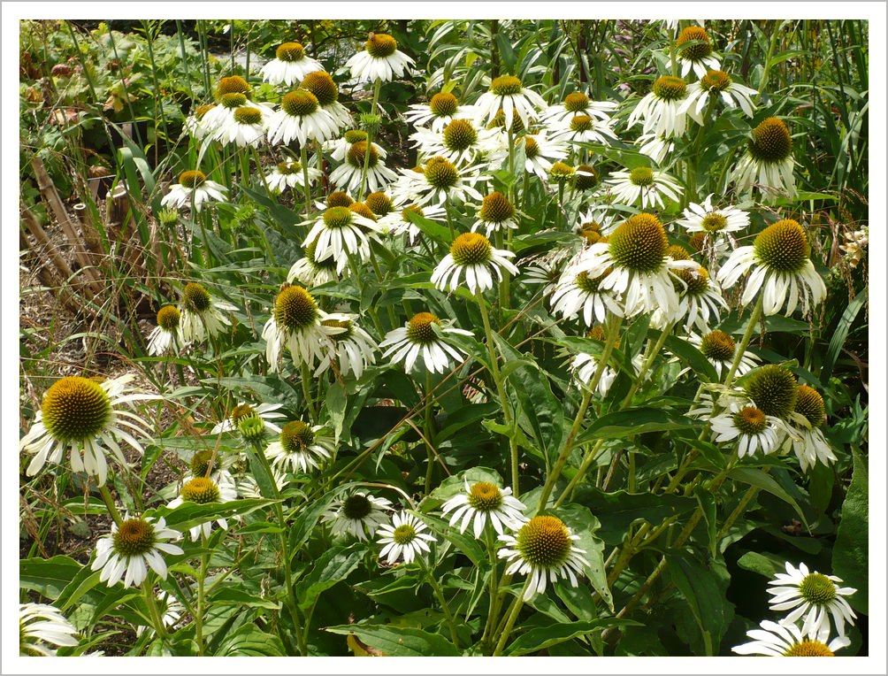 Echinacea purpurea ‘White Swan’ is a late summer flowering perennial with white daisy like flowers and orange/brown centres. It likes a sunny spot and attracts bees and butterflies.