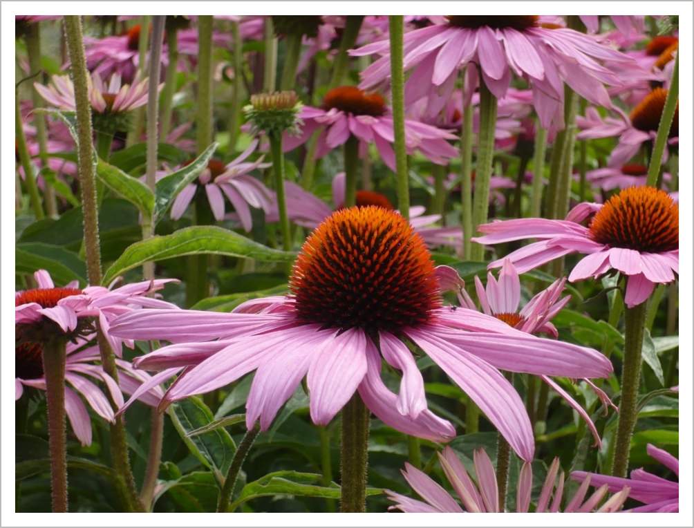 Echinacea purpurea ‘Magnus’ is a late summer flowering perennial with pink wide daisy like flowers with orange/red centres. It likes a sunny spot and attracts bees and butterflies.