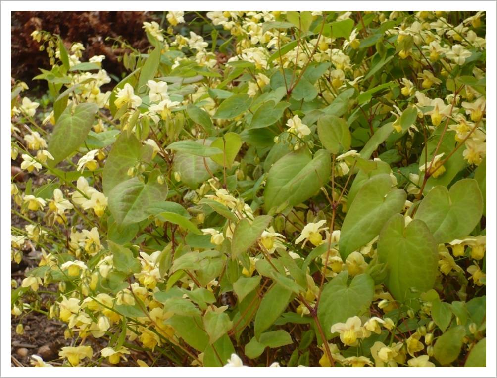 Epimedium x perralchicum ‘Frohnleiten’ is a good evergreen perennial for a shady spot. It has pretty yellow flowers in spring and attractive green/bronze foliage.