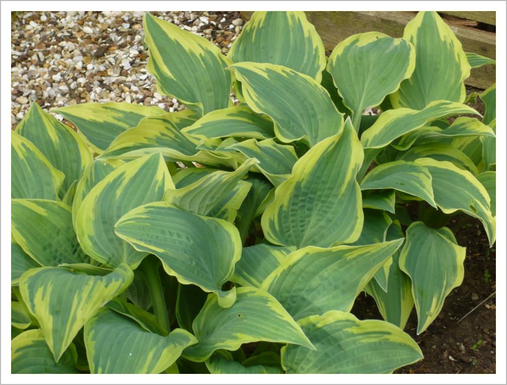 Hostas come in many shapes and sizes from very small to enormous with large leathery leaves covering a metre or more. They need moist shade to do well and you need to be prepared to defend them against slugs.