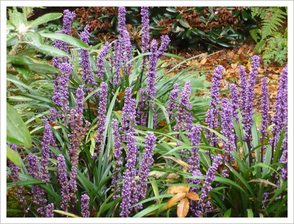 Liriope muscari is a low growing perennial with strappy leaves and purple flower spikes in autumn. It is useful for dry shade.