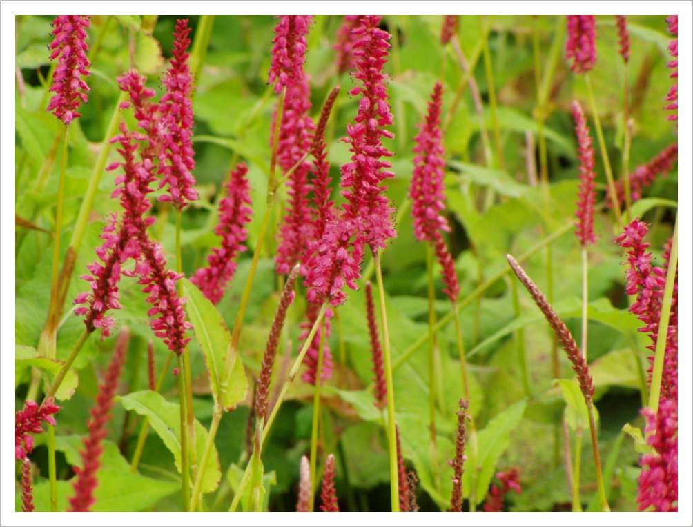 Persicaria amplexicaulis ‘Firetail’ is a large perennial with red flower spikes in late summer. It likes moist soil in sun or partial shade.