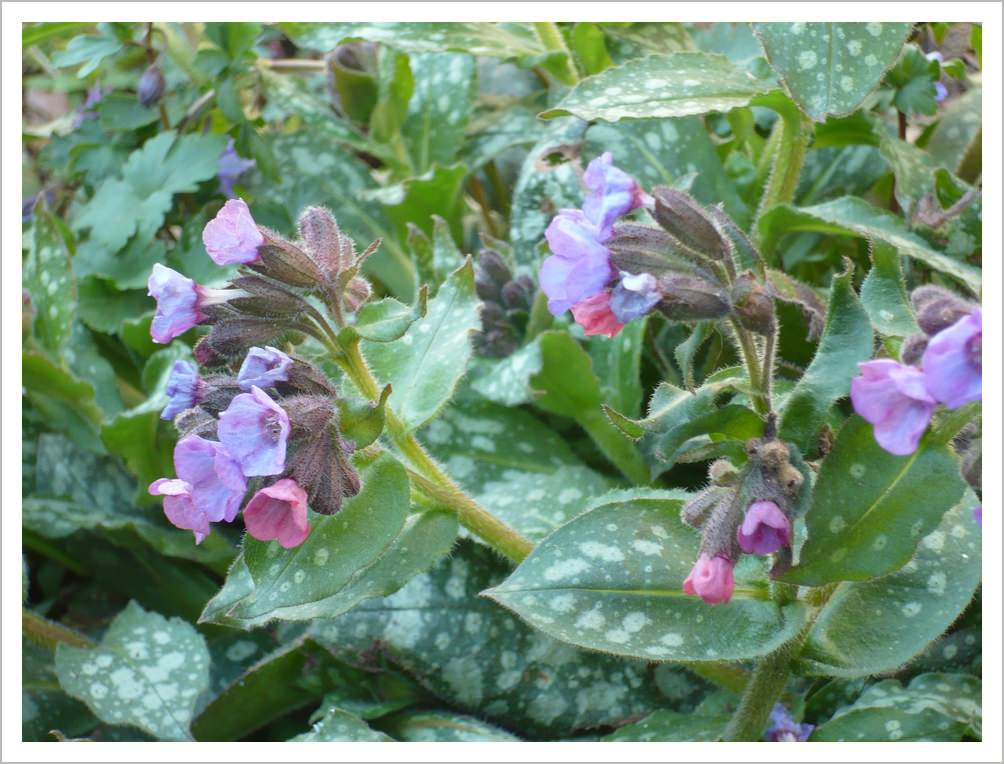 Pulmonaria are low growing spring flowering plants that are one of the first flowers to attract bees. They are good for a shady spot.