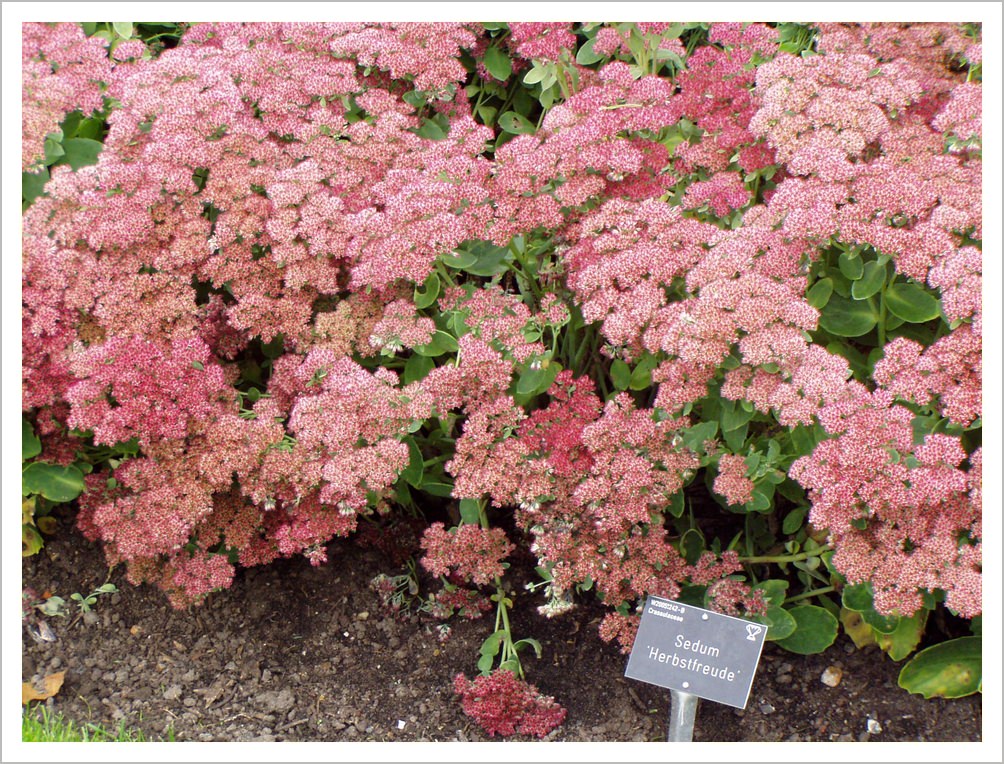 Sedum ‘Herbstfreude’ (Autumn Joy) is a late summer perennial with pink flowers that bees and butterflies love.