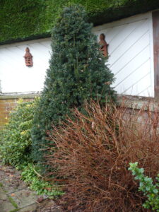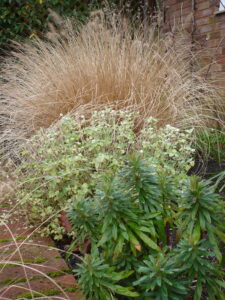 Deciduous shrubs and grasses can also add a contrast in texture or colour as their faded leaves or bare stems contrast in texture, form or colour with other plants such as the redd-ish stems of this Spiraea ‘Goldflame’ in front of a topiary Yew (centre), or the Miscanthus grass against the mounded form of the silvery evergreen Santolina chamaecyparissus and faded stems and flower heads of the Sedum ‘Autumn Joy’ (left).